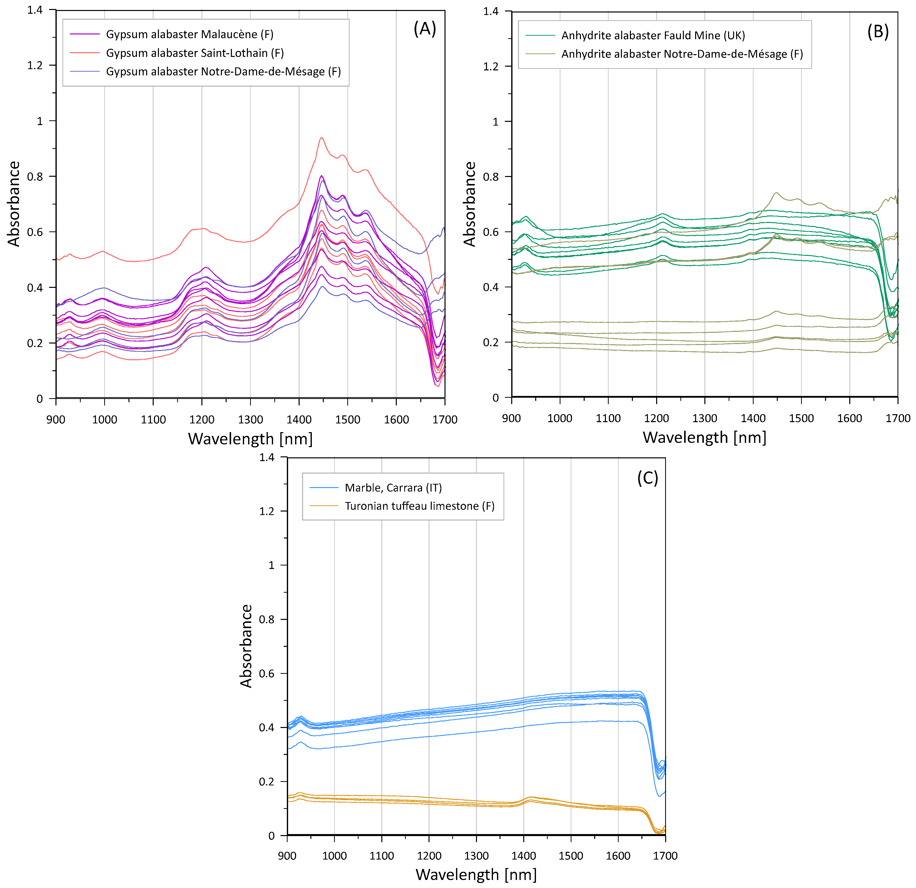 (A) Absorption spectra of gypsum alabaster from the French Saint-Lothain (Jura, F), Notre-Dame-de-Mésage (Isère, F) and Malaucène (Vaucluse, F) quarries; (B) Absorption spectra of anhydrite alabaster from Notre-Dame-de-Mésage (Isère, F) and Fauld Mine (Staffordshire, UK); (C) Absorption spectra of Carrara marble, Turonian tuffeau limestone (Loire Valley, F). The spectral band and their assignments are specified in Table 1.