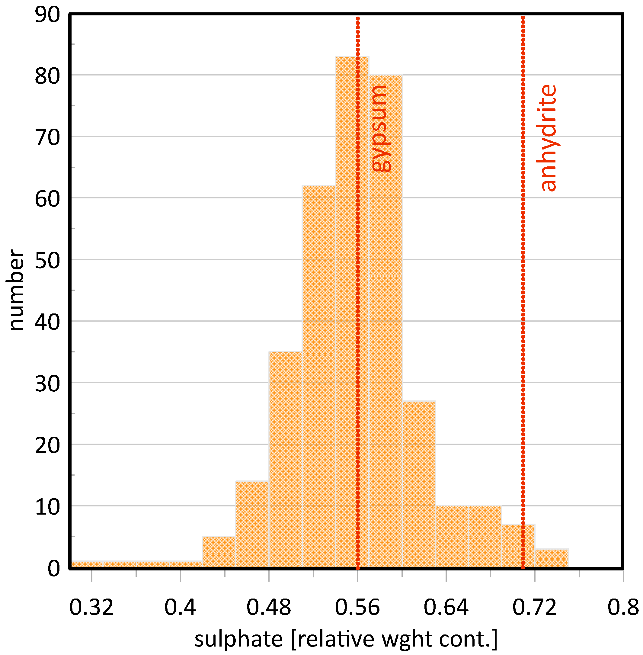 The similarity of the marble and anhydrite spectra might, in cases of pure, water-free anhydrite, lead to an ambiguity of material identification. However, the use of anhydrite alabaster for sculpture is clearly minor with respect to gypsum. Only 12 of the 340 artworks from the 12th to the 17th century (Figure 3) analysed so far in our studies by standard ion chromatography show sulphate contents > 68 wgt%, approaching the theoretical value of 71% for anhydrite, whereas a large majority is situated around the theoretical value of 56% for gypsum. Values < 56% indicate impurities in gypsum alabaster, values between the theoretical gypsum and anhydrite are mixtures of both or partially hydrated anhydrite. In all these cases we can expect the typical spectral features related to the structural water in gypsum, so that we would not expect ambiguities between anhydrite alabaster and marble.