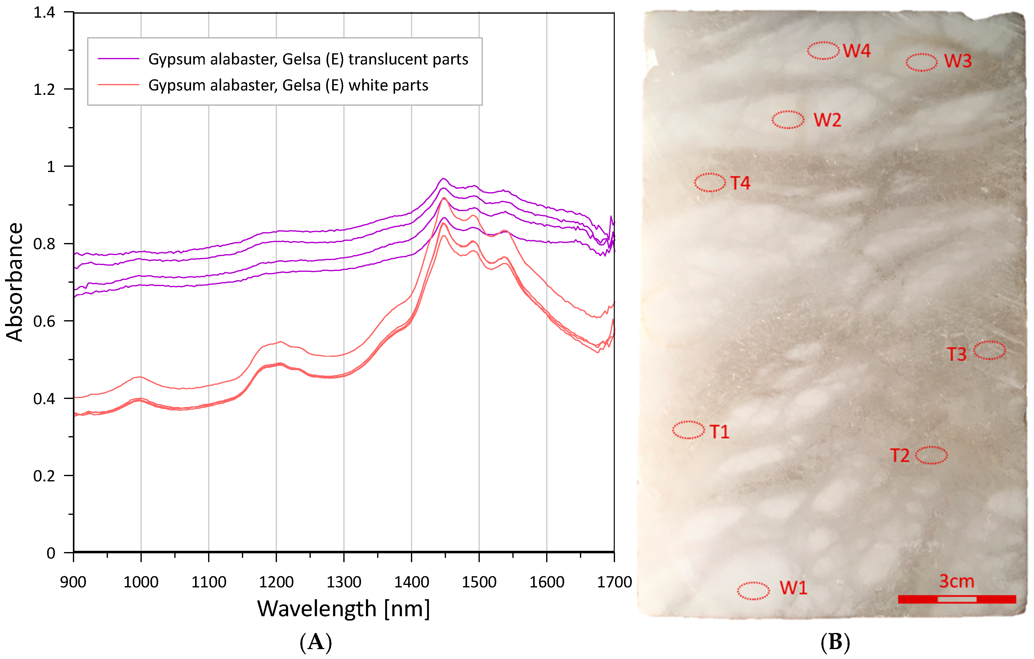The reflectance and overall quality of the NIR spectrum of gypsum alabaster depends on several parameters: on the translucency of the investigated alabaster, the surface roughness, and the distance of the sapphire window from the surface. Diffuse reflectance dominates and is high for unpolished white, opaque, fine- to crypto-crystalline varieties, whereas translucent alabaster, as can be found in certain Spanish and Italian deposits (e.g., Gelsa, Volterra), produce weaker spectra. This is illustrated in Figure 4 which shows the difference between spectra obtained on translucent veins and white fine-crystalline parts of a slab of Gelsa alabaster. The amplitude of the peaks for the veins is less, and the spectra are noisier, even if the characteristic features of gypsum alabaster are preserved. Two families of spectra, as observed for Gelsa alabaster, may be a distinctive feature for specific deposits. Partial anhydritisation of primary gypsum [] or partial rehydration of anhydrite to alabastrine gypsum could also lead to the occurrence of two types of spectra within the same material.