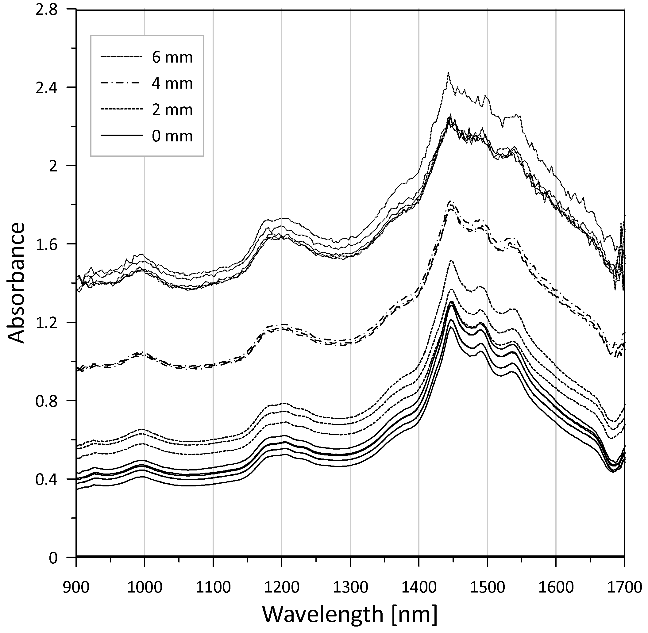 As to be expected, absorbance and noise increase with distance from the surface (Figure 5). Whereas the gypsum spectra are recognisable at all measured distances (2, 4, 6 mm), absorbance increases by a factor of 2.5 at 4 mm and of 6 at 6 mm and the spectra at 6 mm are significantly noisier than the spectra at 0–4 mm.