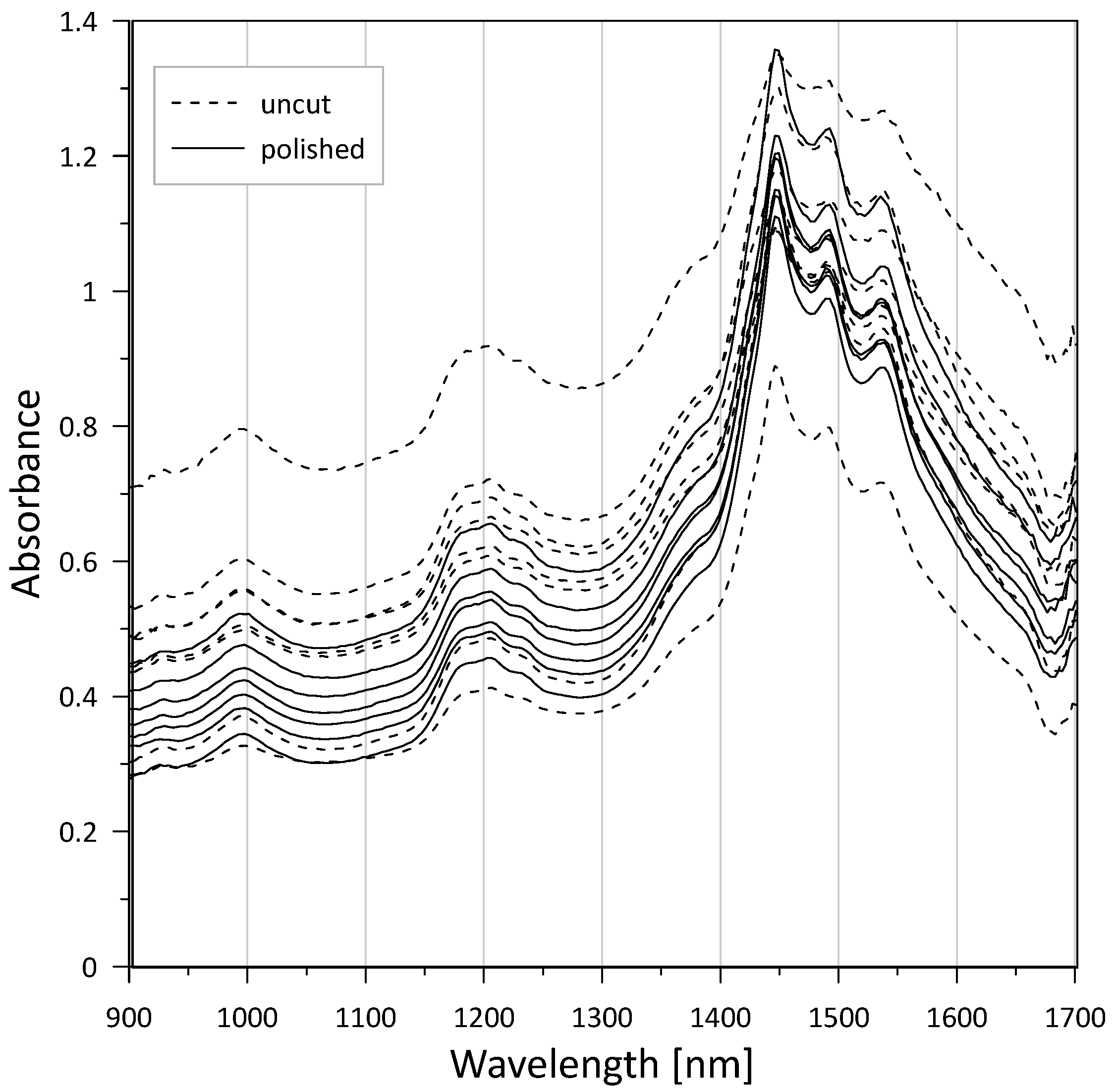 The spectra obtained on polished and raw (uncut, unpolished) alabaster are very similar in most cases, except for some outliers with higher or lower absorbance and noise for the raw material (Figure 6). This shows that even for polished samples, specular reflectance is negligible compared to diffuse reflectance, as otherwise the polished material could be expected to show weaker or less distinct absorption bands and potentially more noise than the unpolished samples. Dominating diffuse reflectance is due to the microstructure of alabaster (unoriented microcrystalline gypsum) and due to the fact that even polished surfaces show a micro-roughness due to interaction with air humidity or contact with water, notably by inappropriate cleaning [].