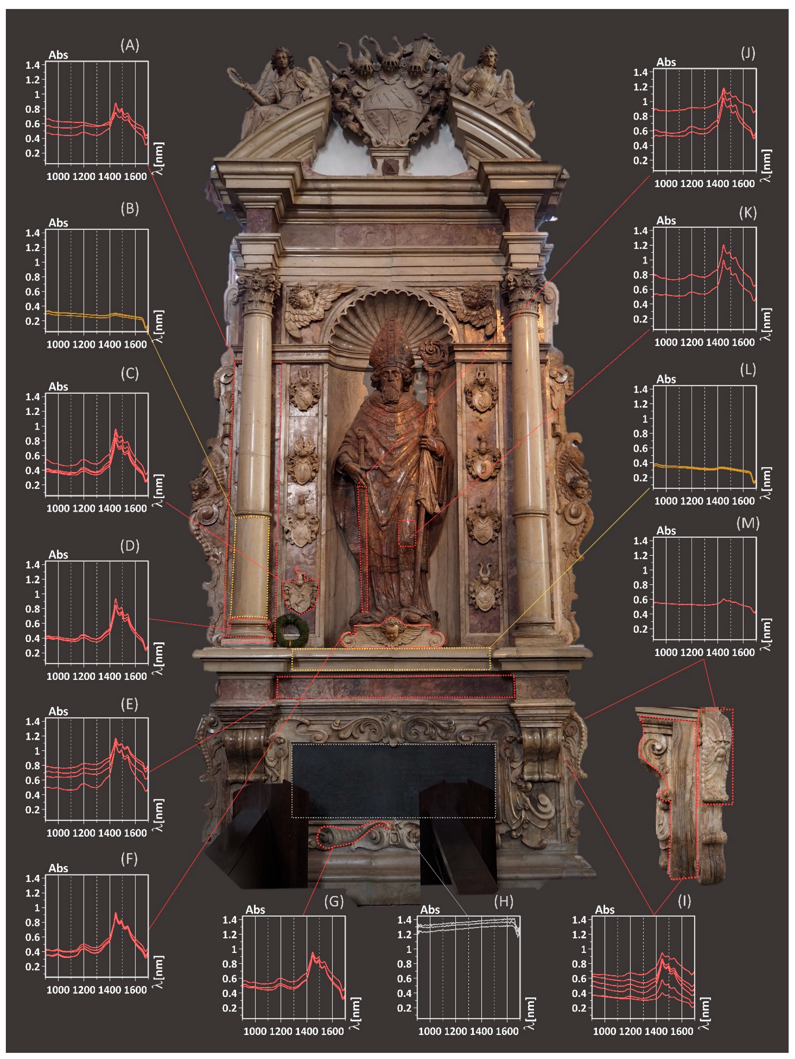 NIR spectra of the funeral monument of Bishop Julius Echter (1545–1617) in the Würzburg Cathedral (Bavaria, Germany). Light brown spectra and zones correspond to limestone and light red spectra and zones have been identified as alabaster.