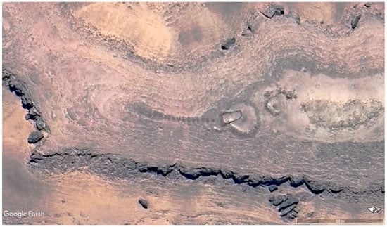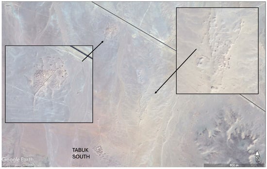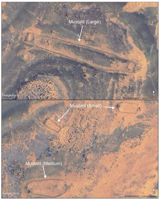 This survey is preceded by comparable archaeological remote sensing surveys by the Endangered Archaeology in the Middle East and North Africa (EAMENA) project of the region to the west in the area affected by the ongoing Neom development, a controversial mega-city and wider landscape development [6], and the central and eastern Nafud desert to the east [7]. The area to the north has been covered briefly by an alignment of temporary Roman military camps in the otherwise remote, relatively empty landscapes of south-east Jordan [8]. The types of structural features visible on satellite imagery in these regions include simple stone-walled corrals likely associated with forms of mobile pastoralism across millennia, as well as more morphologically distinct features such as large hunting kite structures and large rectangular mustatil architecture, both of which have been dated to the Neolithic period [1,2,3,9,10,11]. Cairn structures, often raised as burial monuments, are also frequently detected and built across the prehistoric and pre-Islamic features, with more complex forms such as pendants and ringed cairns emerging in the Bronze Age [2].