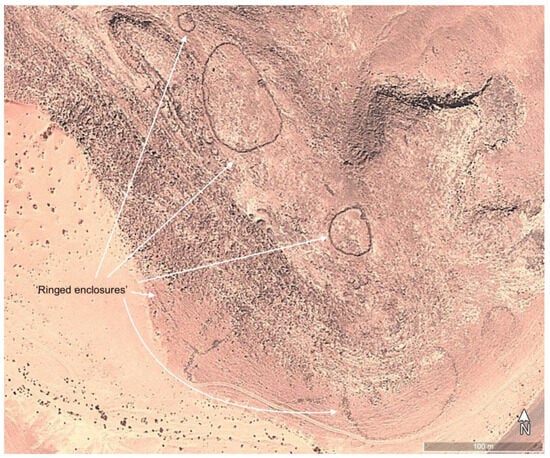 A little-understood form of structure termed ‘ringed enclosure’ (Figure 6), defined by an earlier survey of the Neom development area [6], and separately termed niched enclosures by Fujii [21,22], was identified across the survey area. These structures (n = 45), sometimes occurring as clustered groups, consist of sub-circular walled enclosures, in some cases with an internal diameter more than 100 m, with a cairn or other small structure built into the enclosure perimeter. The largest examples and clustered groups were recorded in the south-west corner of the survey area, but other possible examples were documented across the rest of the study zone. In smaller examples of this monument type, the interpretation certainty was lower as these features were visually comparable with small agricultural/pastoral enclosures found across the survey area.