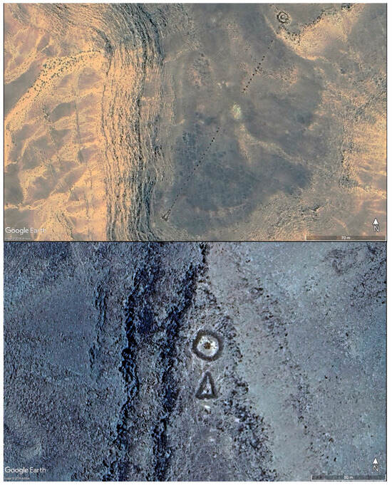 An example of a combined pendant and ringed cairn structure with an elongated triangle tail (above) and a Ringed cairn and triangle structure (below) (Source: Google Earth).
