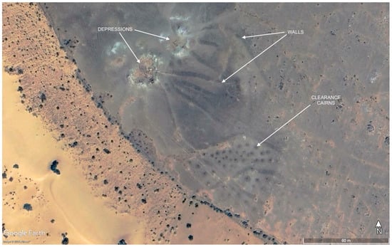 An example of clearance cairns and walls associated with natural depressions (Source: Google Earth).