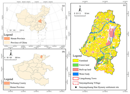 Location analysis map of the research area. (a) Location of Henan Province on the map of China. (b) Location of Neihuang County on the map of Henan Province. (c) Location of the study area on the map of Neihuang County. The base map is taken from the standard map service system (http://bzdt.ch.mnr.gov.cn/index.html, accessed on 20 October 2025).