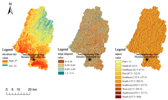 This study systematically investigates settlement sites that record living patterns of ancient humans, aiming to reveal the interactive mechanisms of human–environment relationships. The core issues of landscape archeology research are the surface spatial structure, human spatial cognition, and social practice activities. This article takes the Han Dynasty settlement site in Sanyangzhuang, Neihuang County, Anyang City, Henan Province, as a typical case. It comprehensively uses ArcGIS 10.8 spatial analysis and remote sensing image interpretation techniques to construct spatial distribution models of elevation, slope, and aspect in the study area, and analyzes the process of the Yellow River’s ancient course changes. A regional historical geographic information system was constructed by integrating multiple data sources, including archeological excavation reports, excavated artifacts, and historical documents. At the same time, the sequences of temperature and dry–wet index changes in the study area during the Qin and Han dynasties were quantitatively reconstructed, and a climate evolution map for this period was created based on ancient climate proxy indicators. Drawing on three dimensions of settlement morphology, architectural spatial organization, and agricultural technology systems, this paper provides a deep analysis of the site’s spatial cognitive logic and the ecological wisdom it embodies. The results show the following: (1) The Sanyangzhuang Han Dynasty settlement site reflects the efficient utilization strategy and environmental adaptation mechanism of ancient settlements for land resources, presenting typical scattered characteristics. Its formation mechanism is closely related to the evolution of social systems in the Western Han Dynasty. (2) In terms of site selection, settlements consider practicality and ceremony, which can not only meet basic living needs, but also divide internal functional zones based on the meaning implied by the orientation of the constellations. (3) The widespread use of iron farming tools has promoted the innovation of cultivation techniques, and the implementation of the substitution method has formed an ecological regulation system to cope with seasonal climate change while ensuring agricultural yield. The above results comprehensively reflect three types of ecological wisdom: “ecological adaptation wisdom of integrating homestead and farmland”, “spatial cognitive wisdom of analogy, heaven, law, and earth”, and “agricultural technology wisdom adapted to the times”. This study not only deepens our understanding of the cultural value of the Han Dynasty settlement site in Sanyangzhuang, but also provides a new theoretical perspective, an important paradigm reference, and a methodological reference for the study of ancient settlement ecological wisdom.