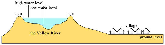 Under the dry climate in the inland it caused severe soil erosion and desertification, and the ecological environment deteriorated. Sedimentation in rivers caused the riverbed to rise constantly. The “Book of Han: Gully Records” records: “At the age of six or seven, the river water surged, increasing by seven zhang and seven chi (approximately 231 cm per zhang and 23.1 cm per chi during the Western Han Dynasty), damaging the south gate of Liyang and entering below the embankment. The water did not exceed two chi from the embankment. Looking north from the embankment, the river was higher than the houses of the people, and they walked up the mountain. After thirteen days of water retention, the embankment collapsed, and the officials and people blocked it.” [27]. This record shows that in the late Western Han Dynasty (around 7 BCE), the Yellow River had already formed a suspended river situation near Liyang (Xun County, Hebi City, about 5 km away from Sanyangzhuang), which was higher than the surrounding houses (Figure 4).