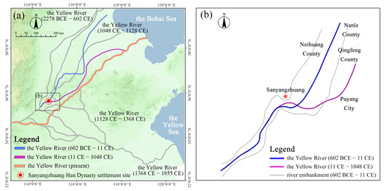 (a) Diagram of each diversion of the Yellow River. (b) Diagram of the relationship between the Yellow River and Sanyangzhuang Han Dynasty Settlement Site in the Western Han Dynasty. The grey line in (a) is the old courses of the Yellow River during other periods that are not within the research time range.