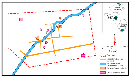 The Sanyangzhuang Han Dynasty settlement site is located in Sanyangzhuang Village, Liangzhuang Town, Neihuang County, Anyang City, Henan Province. It is situated on the old course of the Yellow River and dates back to the late Western Han Dynasty to the early Eastern Han Dynasty (around 50 BCE to 50 CE) [24] (Figure 2). Within the scope of archeological exploration, 14 Han Dynasty courtyards, roads, lakes, ponds, farmland, and other remains have been discovered. Four of the courtyards have been excavated and cleared, with a total area of 9000 square meters. For the first time, the agricultural production status, rural social forms, and living conditions of farmers in the middle and lower reaches of the Yellow River during the Western Han Dynasty (202 BCE to 8 CE) have been visually reproduced. It is a site of great value, rich connotation, and far-reaching influence [25]. In 2010, it was selected for the first batch of national archeological site park projects.