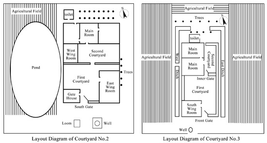 Courtyard No. 2 is located in the northwest direction of Sanyangzhuang Village, with an area of nearly 2000 square meters, and the site has been fully exposed. The first courtyard includes the courtyard wall, south gate, west gate room, and east wing room. Outside the south gate, there are weaving remains, a water well, and a brick-paved path leading from the water well to the south gate. The second courtyard includes the courtyard wall, the west wing room, and the main room. The toilet is located in the northwest, adjacent to the courtyard. An oval-shaped pond was excavated on the west side of the courtyard, surrounded by north–south ridges on the east, north, and west sides [33]. The area of the courtyard No. 3 is approximately 900 square meters. The first courtyard has a courtyard wall, a south gate, and a south wing room. The second courtyard features a main room facing west and a toilet located on the west side, outside the back gate. Multiple clear ruts and cow hoof marks were found in the open space outside the south gate. There are two rows of tree remains on the north side of the courtyard, which are judged to be mulberry and elm trees based on the remaining leaf traces. Field ridges surround them, and there are water ditches on the west and east sides (Figure 7). Courtyard No. 4 is located 25 m east of Courtyard No. 3, with a layout similar to that of Courtyard No. 3, except that there is no ditch on the west side of the courtyard, but a row of north–south trees [34].