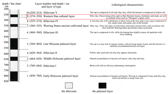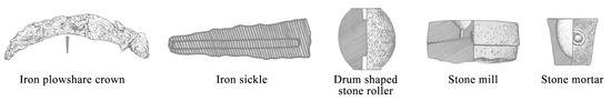 - Liu, X. Archaeological Research on Agriculture and Rural Settlements in the Pre-Qin and Han Dynasties; Cultural Relics Publishing House: Beijing, China, 2017; pp. 279–280. [Google Scholar]