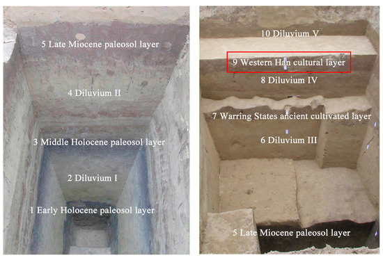 Archeological photos of the Han Dynasty settlement site section in Sanyangzhuang. The red box in the picture indicates the section of Western Han soil layer.