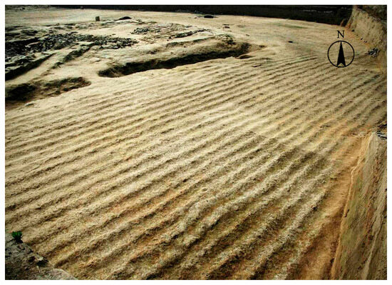 The vast remains of cultivated farmland revealed by the Sanyangzhuang Han Dynasty settlement site provide valuable physical evidence for a deeper understanding of Han Dynasty agricultural cultivation techniques (Figure 10). The width of a ridge or ditch in the ruins is generally 60 cm, and the height from the highest point to the lowest point is about 6 cm. Large areas of farmland ruins were discovered around each courtyard, presenting a pattern of alternating ridges and ditches. Taking the courtyard No. 3 as an example, the overall direction of Tianlong has two directions: east–west and north–south, with the north–south direction being the most common [36] (Figure 11).
