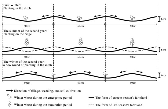 When winter arrives, the Mongolian high pressure system moves from the mainland to the sea, and the northwest wind generated causes a temperature drop in the North China Plain, which can lead to crops suffering from cold and other disasters. Most of the farmland in Sanyangzhuang is surrounded by courtyards, the farmland and courtyards are oriented towards the southwest [36], with a significant angle difference from the winter wind direction, which can to some extent resist the invasion of severe cold and provide protection for seedlings. Under the current conditions of low precipitation and arid climate, sowing winter wheat seeds in ridges and ditches can effectively maintain soil moisture.