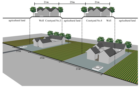 During the Han Dynasty (202 BCE to 220 CE), Neihuang County was part of Fanyang County and fell under the jurisdiction of Wei Commandery. The Han dynasty inherited the Qin dynasty’s system and implemented an administrative management system of commander, county, township, and village (li). As the most basic management unit, a “li” implements the system of “five households as neighbors, five neighbors as li, and twenty-five households as one li”. The excavation method is the large-scale exposure method, which involves meticulous cleaning layer by layer to protect and display the original site, and fully restores the spatial structure of the Han Dynasty agricultural settlement [30]. To date, 14 Han Dynasty courtyards, comprising 14 households, have been discovered at the Sanyangzhuang site. The four excavated courtyards all face north and south in the same direction (approximately 10° southwest), forming a two-courtyard layout [31] (Figure 6). Each family’s courtyard is situated in its own field, with large areas of farmland separating the courtyards, and clear ridges visible in the farmland. These courtyards are neither organized nor listed, and they are in a completely scattered form [32].