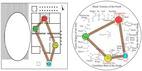 The Twenty Eight Mansions, as a core component of the ancient Chinese astronomical system, are closely related to the layout of courtyards, as reflected in the profound influence of the philosophical concept of “unity of heaven and human” on architectural space. Through directional symbolism, they indirectly shape the order of architectural space. The excavated Courtyard No. 2 has the main room corresponding to the “room” of the Northern Seven Mansions, the west wing room corresponding to the “room” of the Eastern Seven Mansions, and the south side well and east wing room corresponding to the well and Zhang of the Southern Seven Mansions [41] (Figure 14). The four mansions of room, house, well, and Zhang are, respectively, responsible for the core functions of living, storage, water source management, and social etiquette within the courtyard. This layout combines astronomical symbols with practical needs, reflecting the wisdom of ancient architecture’s “analogy of heaven and law of earth”. From a semiotic perspective, the star system centered around the twenty eight mansions is deeply connected to the layout of ancient courtyards, constructing a symbolic coordinate system for ancient architectural spaces. This spatial planning not only meets the needs of daily life but also achieves the translation of astronomical concepts into architectural vocabulary through the symbolic meaning of mansions, endowing buildings with deep cultural connotations and spiritual sustenance.