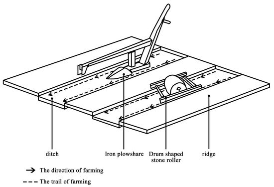 The farmland cultivation in Sanyangzhuang employs the Daitian method, which is a farming method invented and promoted by the agricultural scholar Zhao Guo during the mid-Western Han Dynasty. The specific operation involves opening three trenches, each one foot wide and one foot deep, on a long strip of land measuring one acre in area. Firstly, the soil in the farmland is plowed and sorted. When sowing, the flat soil to be planted is trimmed into a pattern of alternating ridges and ditches. Then, crop seeds are sown in the ditches. During the implementation of weeding and soil cultivation, the soil on the ridges is gradually pushed into the ditches to cultivate crops. In the second year, the positions of the ditches and ridges are exchanged [37]. The positions of ditches and ridges rotate every year, hence they are called ‘daitian’ (‘dai’ means replace, ‘tian’ means farmland). Sow in the ditches in winter, and the seedlings grow up in summer. After soil cultivation, it becomes ridges tillage (Figure 12). Based on the analysis of geographical and environmental conditions in the previous text, agricultural production in Sanyangzhuang during the Han Dynasty was characterized by a northern dryland agricultural system, primarily focused on drought resistance and soil moisture preservation. This farming method is beneficial for maintaining soil fertility and plays a role in preventing wind and drought. It has the following technical characteristics: firstly, alternating ditches and ridges. The seeds are sown in the ditches, and after emergence, the soil on the ridges is filled into the ditches by combining with tillage and weeding. Its function is to prevent wind, lodging, moisture, and drought. The second is the exchange of ditches and ridges. The positions of ridges and ditches rotate year by year, and since crops are always sown in ditches, the exchange of ridges and ditches achieves the purpose of land rotation and utilization. Therefore, the Daitian method is actually a precision farming technology system, which is adopted to address the problems of soil fertility decline, drought, and other conditions encountered in agricultural production. It is a systematic technology that integrates soil fertility, drought resistance, moisture retention, wind resistance, and lodging prevention, thereby improving production efficiency and increasing crop yields.