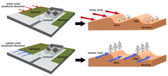 Schematic diagram of the relationship between winter and summer wind direction and field ridges.