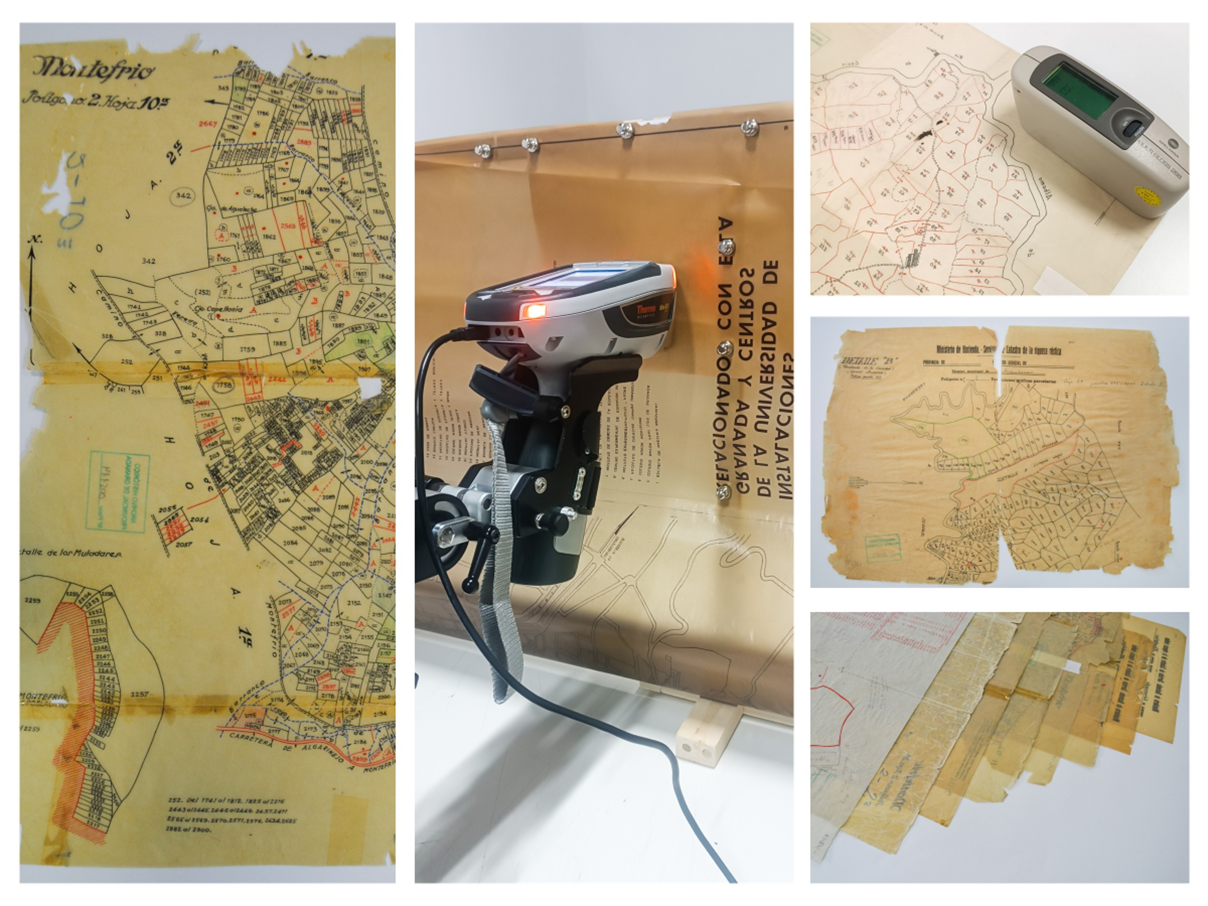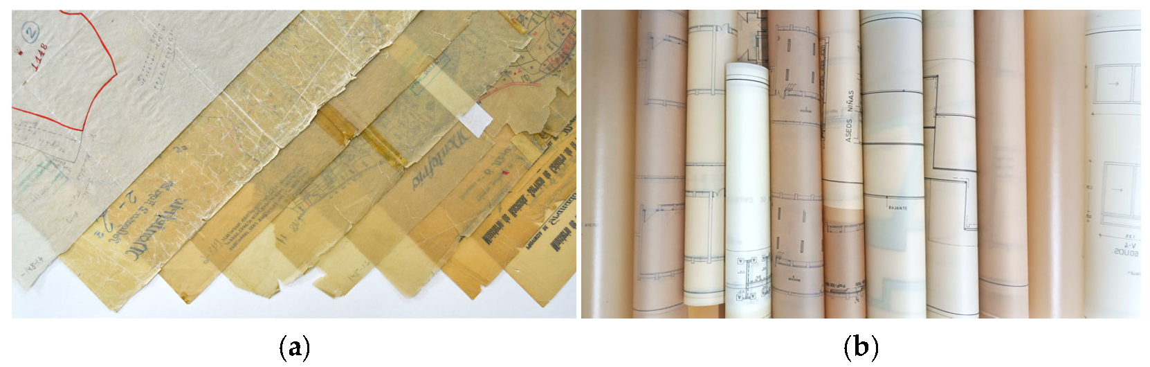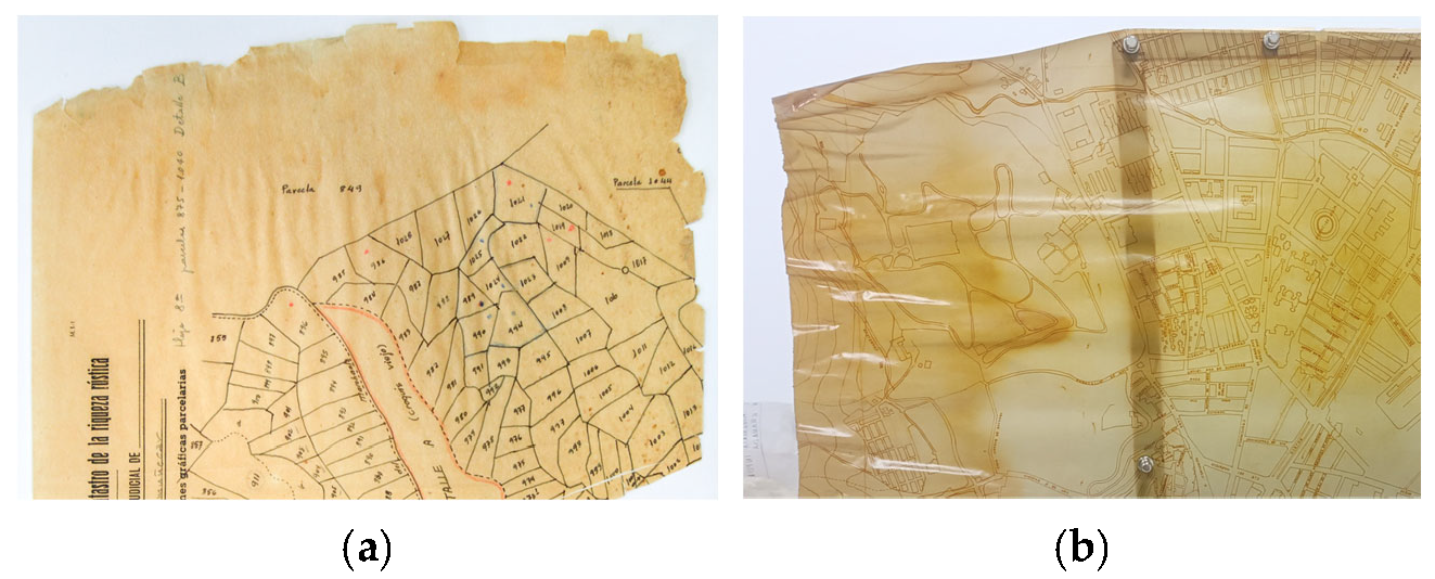 - Physical–mechanical alterations:Brittleness and friability: extreme fragility due to acidification processes, light exposure, handling, and variations in humidity and temperature.Abrasion: surface wear commonly caused by improper handling, lack of cleaning, weakening, or chemical alteration of the support.Deformation: alteration of the paper’s flatness due to environmental variations, especially humidity, as well as handling or improper storage (rolled, folded, etc.).Folds: deformations caused by improper handling or packaging. In fragile papers, folds can generate fractures and loss of support.Fracture: physical damage manifested as a broken line with microcracks in the cellulose fibers caused by folding. In translucent papers, these appear as light-toned lines.Tear: separation of the paper due to tension or localized fragility arising from folds or fractures, exposing and weakening the structural fibers of the support.Loss of support: loss of parts of the document, generally due to tears, metallic elements (staples), or incorrect handling. In this type of support, due to its characteristics and function, it is important to evaluate whether the missing material is the result of alteration or an original irregularity of the document.Surface dirt and stains: accumulation of external particles such as dust, environmental contaminants, or biological residues on the paper surface. This presence can result in localized stains or chromatic alterations caused by multiple factors: microorganisms, adhesives, metals, fats, humidity, or chemical degradation processes. The most frequent manifestations include:Tape stains: yellowing and darkening that are difficult to remove, caused by the degradation of tape adhesives. In this study, three types of tape are highlighted: paper tape with rubber adhesive, transparent cellulose acetate tape, and polypropylene packaging tape.Migration stains: caused by contact of the paper with water, which carries soluble substances, leaving an irregular dark edge.Contact stains: transfer of generally soluble compounds from one document to another due to direct contact.Stains from the addition of fatty substances: irregular application and absorption can, after aging and oxidation processes, produce yellowing, darkening, and a heterogeneous staining pattern. In addition, these substances may create some surface stickiness, attracting dirt and facilitating adhesion and contamination of other documents in contact.Alterations from additives or anthropogenic causes: stains, tears, or loss of material caused by elements such as staples, clips, or other objects added later.