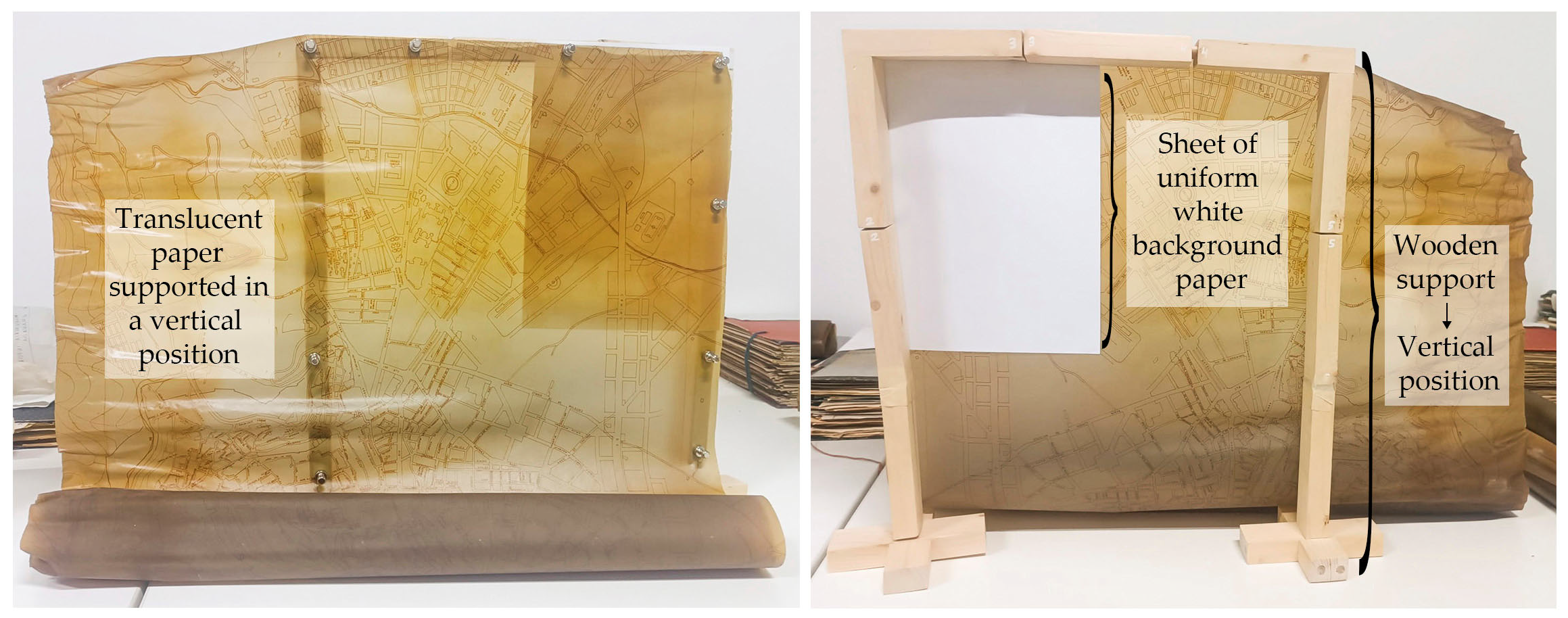 - Lorente, R.; López, A.; Blanc, R. Planimetría en soportes traslúcidos de la Colección de Planos del Archivo del Patronato de la Alhambra y Generalife: Identificación mediante tecnología in situ no invasiva. Cuad. De La Alhambra 2024, 53, 101–117. [Google Scholar]