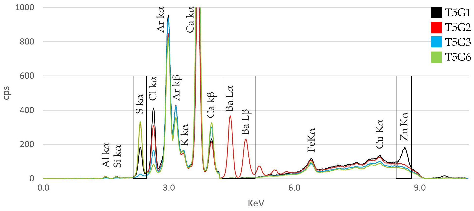 - Sulfur (S): this is a key element regarding the study of sulfurized papers (produced mainly through treatments with sulfuric acid); however, its use as an additive in paper manufacturing processes or in sulfite and bisulfite chemical pulps should also be considered [44]. In Figure 5, higher-intensity sulfur bands can be observed along with elements such as barium or zinc in their composition (T5G1 and T5G2). Among the documents containing sulfur accompanied only by elements common to the rest of the documents, intense sulfur bands were identified in only 2% of cases (T5G6) compared to 55% of papers showing weak sulfur bands (T5G3). It is noteworthy that the presence of sulfur accompanied by other elements could also be due to its action as sulfates or components of additives, ruling out its presence as an indicator of sulfuric acid use, which is typical of sulfurized translucent papers.