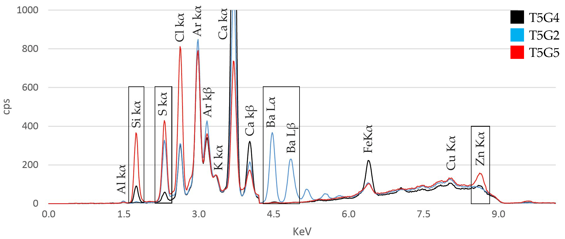 - Barium (Ba): although theoretically not mentioned as a relevant element in the manufacture of translucent papers, there are references associating its use as a filler or in bleaching processes to improve surface properties in cellulosic supports [40]. Observing Table 5, and in the specific case of group T5G2, a significant presence of barium is found in relation to the other elements, associated in all cases with intense sulfur bands, absence of zinc, and the presence of silicon only as traces (Figure 6). Despite its absence in descriptions of translucent support manufacturing processes, its highly specific behavior suggests that it could act as a chemical marker for a specific type of translucent paper. Additionally, these papers visually show a tendency toward less yellowed and darker tones, especially compared to documents classified in group T3G1 of Table 3. However, this phenomenon cannot be attributed solely to the presence of barium, as documents without barium also exhibit similar characteristics.
