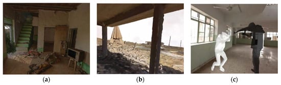 Scenes from the Nobody’s Listening (NL) VR experience: (a) A destroyed and abandoned living room representing the aftermath of the ISIS genocide in Kocho village. (b) A view from beneath a damaged structure, looking out toward a destroyed Yazidi temple, highlighting cultural heritage destruction by ISIS. (c) A sensitive reenactment of violence by ISIS, using ghostly silhouettes to depict a moment of assault within a school corridor. Images reproduced with permission from the creators of the NL VR experience.