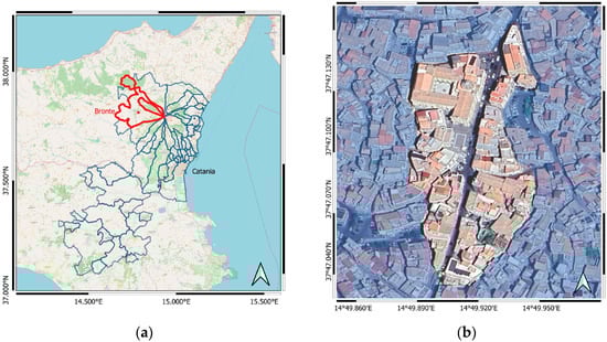 The municipality of Bronte: (a) territorial framework with respect to the Catania area; (b) the investigated Bronte area for Soil–Structure Interaction (SSI) effects using a large-scale assessment procedure.