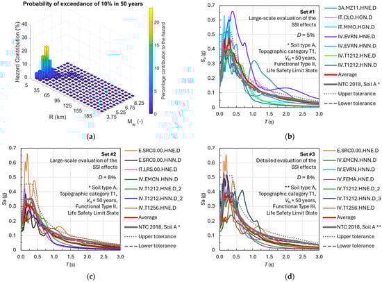 Selection of the seismic motions: (a) range values for the disaggregation of the seismic hazard considering a probability of exceedance of 10% in 50 years; (b) elastic response spectra for the set #1, large-scale evaluation of SSI effects for the reinforced concrete structures with D = 5%; (c) elastic response spectra for the set #2, large-scale evaluation of SSI effects for the masonry structures with D = 8%; (d) elastic response spectra for the set #3, detailed evaluation of SSI effects for the bell-tower with D = 8%. Data compared with the elastic response spectra proposed by NTC 2018 [57].