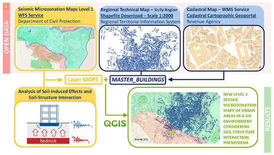 As introduced in Section 2.1, the study area encompasses the urban fabric in the historic center of Bronte, including the San Giovanni Evangelista bell tower. The historical buildings are predominantly composed of bearing-wall masonry structures from the 18th and 19th centuries, constructed with volcanic stone and brick, and later modified in the 20th century. The framework advances traditional cartographic representations of SM maps derived from LSR analyses. It does so by optimizing the structure of vector-based thematic layers for homogeneous zones and incorporating additional layers describing the built environment. More specifically, the system is supported by a geodatabase of vector-based thematic layers, developed in accordance with ICMS 2008 guidelines and Italian SM Standards [72], which stores data and generates thematic maps. The data layers can be obtained from the Information and Cartographic Portal of Seismic Microzonation Studies and Limit Condition for Emergency Analysis [73]. The portal also makes its contents accessible via WMS (Web Map Service) and WFS (Web Feature Service), both OGC (Open Geospatial Consortium) standards, enabling the sharing of geospatial data and ensuring compatibility with GIS (Geographic Information Systems) environments. Additional information on the built environment has been integrated into the framework, including data from the Sicilian Region’s Cartographic Portal and the Italian Revenue Agency [74]. Figure 5 presents a flowchart that illustrates the structure and organization of the geodatabase developed for the large-scale assessment of SSI effects. The diagram shows the process of integrating open data from various institutional sources—Level 1 Seismic Microzonation Maps (Department of Civil Protection), the Regional Technical Map (Sicilian Region), and the Cadastral Map (Italian Revenue Agency)—within the QGIS environment. These datasets are combined to generate the Master buildings layer, to which the data from the Microzones Homogeneous in Seismic Perspective (MOPS) and the results of Local Seismic Response analyses are associated. This process enables the production of advanced SM maps that incorporate SSI effects.