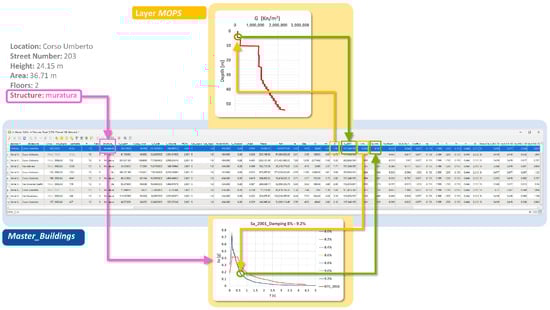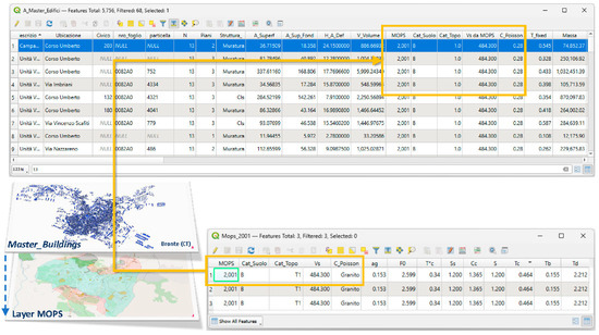 After data acquisition and reprojection, it was necessary to define all the information required for SSI evaluation into a single layer. This layer needed to include not only the physical attributes of each building but also the geotechnical parameters of the site, while allowing classification based on the building’s location and typology. For this purpose, two core components were defined: the MOPS layer, which contained the geotechnical and seismic characteristics of the study area, and the Master Buildings layer, a polygon-based layer that encompassed all buildings within the study area, including their physical attributes. To enable the evaluation of SSI effects, a spatial association was established between the two layers, specifically between microzones and buildings (Figure 6). In this way, each building was assigned to the geotechnical properties of the MOPS on which it is located. The integration of these datasets into a single layer, combining both building-related attributes and geotechnical parameters, formed the integrated framework for all subsequent analyses.