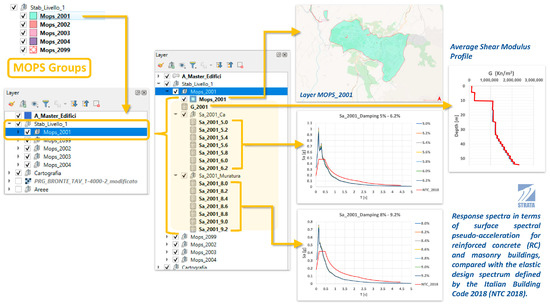 Additionally, the MOPS layers were organized into groups to include the results of LSR analyses performed using STRATA software (version 0.2.0) [77] and utilizing the seismic motion sets #1 and #2, as described in Section 2.2. The output data includes the variation in the shear modulus (G) and the mean response spectra for each set evaluated at the soil surface. Response spectra were computed by differentiating the results according to the structural typology, considering reinforced concrete buildings (D = 5%) and masonry buildings (D = 8%), and by using constant intervals of damping to account for its variability due to SSI effects, denoted as DSSI (Figure 8). During data querying, the software utilizes the selected structural typology, along with the corresponding period and damping ratio values, to determine the appropriate spectral ordinates. The results processed with STRATA software were imported into the software as tabular layers. STRATA software enables the management, processing, and visualization of stratigraphic data derived from geotechnical investigations and borehole surveys; however, its direct integration within GIS software environments is not natively supported.