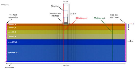 The FEM model (Figure 11) was developed with a soil domain 54.0 m deep and 168.0 m wide to reduce boundary effects and accurately simulate wave propagation. Stratigraphy was assigned according to the geotechnical profile (Figure 3a), while the structure—25.8 m in height and 6.0 m in width (Section 2.1)—was centrally placed. Geometry was derived from Section A–A (Figure 2b); the geometry of the pyramidal cusp was linearized, a common simplification in such analyses that preserves the overall mass and the stiffness of the main masonry walls. Soil layers were discretized using plane-strain four-node solid elements, whereas the structure was modeled with plane stress four-node solid elements. The contribution of the internal floors to the in-plane stiffness was simulated using rigid links at each level (Figure 11), ensuring a realistic coupling between the opposing walls. Mesh sizes satisfied the criterion of being smaller than one-eighth of the shortest wavelength of the input signal [86].