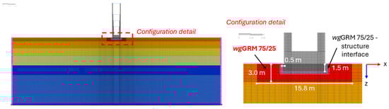 In this study, the effectiveness of GSI systems in mitigating seismic risk is assessed. In particular, attention is given to the performance of well-graded Gravel–Rubber Mixtures (wgGRMs) with a 25% volumetric rubber content (hereafter referred to as wgGRMs 75/25), applied beneath and alongside the foundation of the St. Giovanni Evangelista bell-tower. The behavior of the adopted wgGRMs 75/25 has been thoroughly investigated in the literature [48,49] through drained monotonic triaxial tests, bender element tests, and drained cyclic triaxial tests. In the present study, the structure is fully isolated by a wgGRMs 75/25 layer with a height of 3.00 m and a total width of 15.80 m. To analyze the performance of this mixture, a finite element model (FEM) was developed (Figure 12) with the same characteristics as the reference FEM model described in Section 4.1. The comparison of the FEM model results allows us to highlight how wgGRMs 75/25 can affect the performance of the structure, providing insights into its suitability as a GSI system.