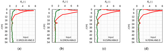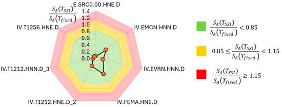 As for the large-scale evaluation of the SSI effects, the spectra were defined for the following site and design conditions: Soil type A, Topographic category T1, Nominal Life (VN) of 50 years, Functional Type II, and Life Safety Limit State. The final average spectra fall within a tolerance band of −10% to +30% of the reference response spectrum over the period range 0.15–2.0 s. The elastic response spectra were obtained considering a damping of 5% and 8%, which were adopted for reinforced concrete and masonry buildings, respectively, according to NTC 2018 [57].