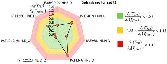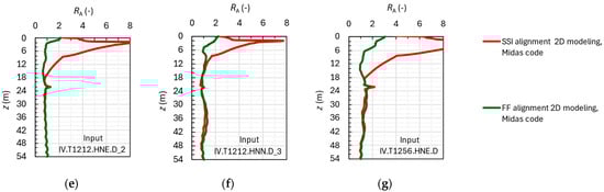 Regarding the detailed evaluation of the SSI effects, the spectrum was defined based on the previous site and design conditions, except for the Function Type. For the bell-tower, Functional Type III was selected based on the detailed scale analysis carried out and according to guidelines for “The assessment and reduction of seismic risk of cultural heritage aligned with the new NTC 2008” [70]. Additionally, a damping of 8% was considered for a masonry structure, according to NTC 2018 [57]. Figure 4b,c show the elastic response spectra used for the large-scale evaluation of SSI effects. Figure 4d presents the elastic response spectra, which are used for a detailed evaluation of the SSI effects. Table 1 summarizes the key characteristics of the seismic motions, including Mw, ag (peak ground acceleration), and R.