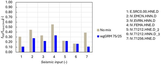 The wgGRMs 75/25 layer was discretized using plane-strain four-node solid elements with a mesh size that satisfied the criterion of being smaller than one-eighth of the shortest wavelength of the input signal [86]. The HSsmall model was adopted to reproduce the mechanical behavior of the mixture. The calibration and validation of the HSsmall model parameters were performed following an iterative trial-and-error procedure proposed by Fiamingo et al. [101]. Specifically, it was based on the results of monotonic drained triaxial compression tests conducted on wgGRMs under a confining pressure of 100 kPa, as reported in Fiamingo et al. [48]. These monotonic triaxial tests were reproduced through FEM simulations of a half-cylindrical specimen, consistent with the configuration described in Section 4.1, and employing the same 3D elements and boundary conditions. Regarding the loading conditions, both the isotropic consolidation phase and the monotonic shearing phase were considered. As for the parameters of the HSsmall model, already presented in Section 4.1 for LC layers, G0ref was determined from bender element tests conducted in a prior study on the same mixtures [49]. m was fine-tuned using an iterative optimization process. γ0.7 was derived from data obtained in cyclic triaxial tests [49]. E50ref, Eoedref and Eurref were calibrated by a trial-and-error procedure, as fully described in Fiamingo et al. [45]. νur was taken as 0.30, based on Fiamingo et al. [101]. k0, was estimated using the formulation proposed by Jâky [94] for coarse-grained soils. Rf was another parameter finalized through the iterative calibration process, according to Fiamingo et al. [101]. Finally, c′, φ′, ψ, and D0 were sourced directly from the comprehensive laboratory characterization of the mixtures [48,49]. Table 5 summarizes the HSsmall parameters adopted for the wgGRMs 75/25 layer; further details about the interpretation and validation are provided in Fiamingo et al. [45]. Rayleigh damping was assigned to the wgGRMs 75/25, assuming a damping ratio equal to 4%, according to Fiamingo et al. [49]. At the base of the model, seismic motion set #3 was applied to investigate the SSI effects in detail, the same set adopted for the model without wgGRMs.