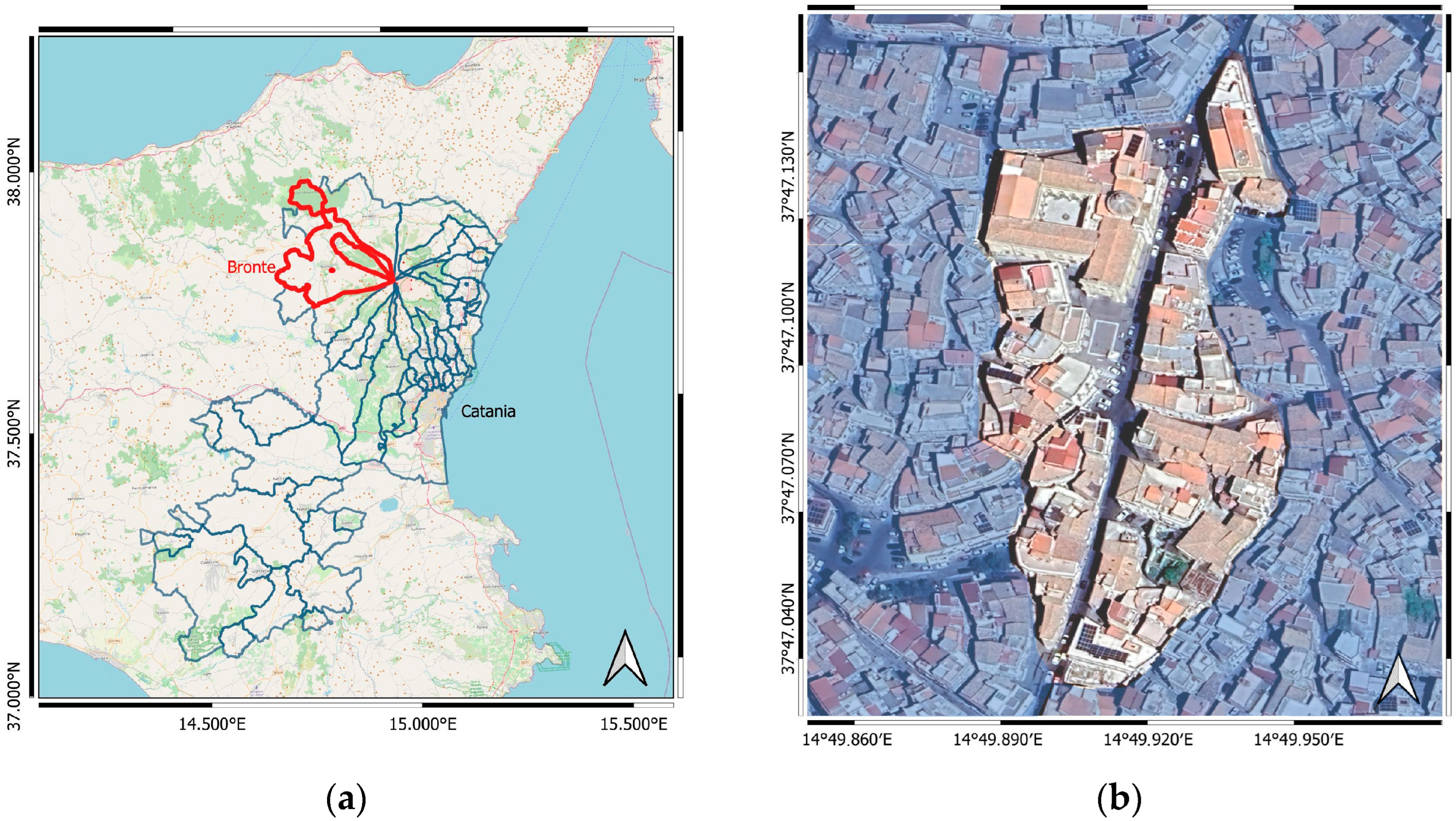- Urban representativeness: The historic center of Bronte preserves a dense medieval layout with numerous unreinforced-masonry buildings and narrow streets, typifying many small and medium-sized Sicilian towns. Therefore, results obtained here can be readily transferred to similar heritage contexts across the region.
