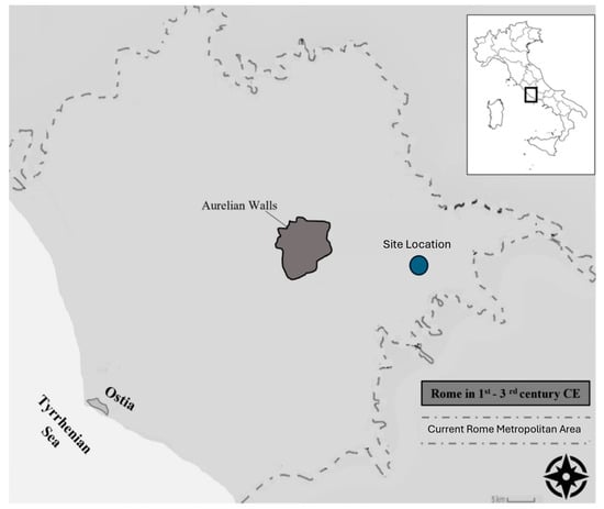 The skeleton was identified during a rescue archaeology activity along the ancient Via Labicana (Figure 1) in 2022 and excavated following the Italian guidelines for the management of human bone remains []. Emergency excavations such as that presented here represent a crucial component of archaeological and bioarchaeological practice, undertaken when sites or buried remains face imminent threats of destruction or disturbance. Such situation arose unexpectedly, prompted by infrastructure development, that jeopardized the preservation of cultural and biological heritage. Thus, unlike planned research excavations, the excavation was conducted under constrained conditions, requiring rapid assessment, strategic prioritization, and methodological flexibility, with the principal objective to retrieve and record as much contextual and material information as possible within a limited timeframe, ensuring that the analysis and interpretation remain scientifically valid [].