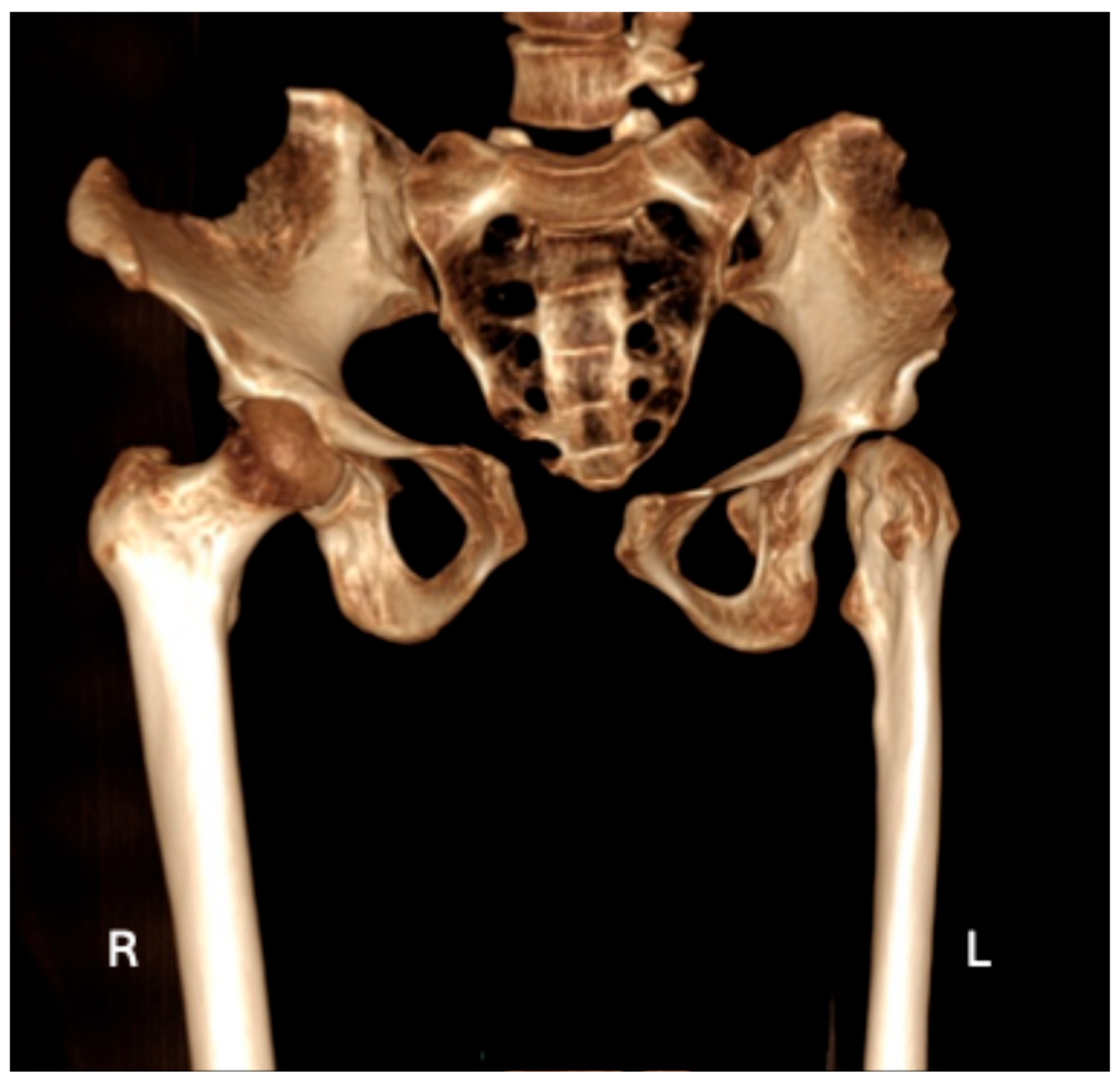 This paper presents a case study of a pathological condition identified in the lower limb bones of an individual buried along the ancient Via Labicana, in the southeastern periphery of the Roman Suburbium, dating to Late Antiquity (3rd–5th centuries CE). The individual, found within a multiple burial context, exhibited an unusual and pronounced dysmorphism of the left hip joint, prompting a detailed analysis integrating osteological and imaging techniques. Following the Italian guidelines for the management of human skeletal remains [], the remains were assessed for preservation quality, basic demographic characteristics, and morphological anomalies. The visual inspection of the post-cranial skeleton revealed a flattened and shallow acetabulum alongside a hypoplastic or aplastic femoral head—anomalies indicative of a severe defect affecting the hip joint. The absence of secondary pathological signs such as reactive bone formation or infection suggests a non-traumatic, possibly congenital etiology.