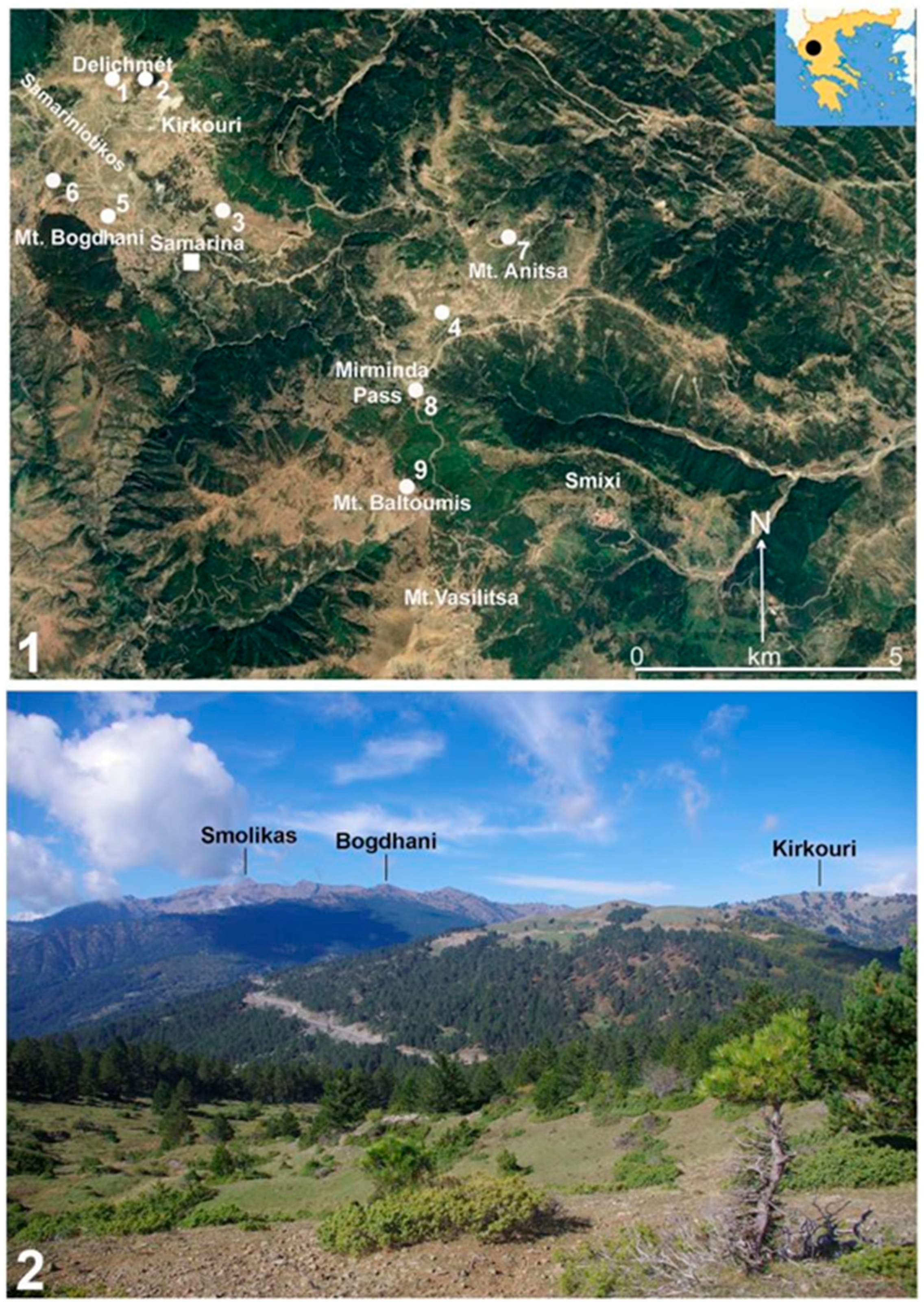 - Biagi, P.; Starnini, E.; Efstratiou, N.; Nisbet, R.; Hughes, P.D.; Woodward, J.C. Mountain Landscape and Human Settlement in the Pindus Range: The Samarina Highland Zones of Western Macedonia, Greece. Land 2023, 12, 96. [Google Scholar] [CrossRef]