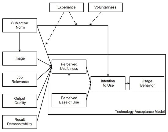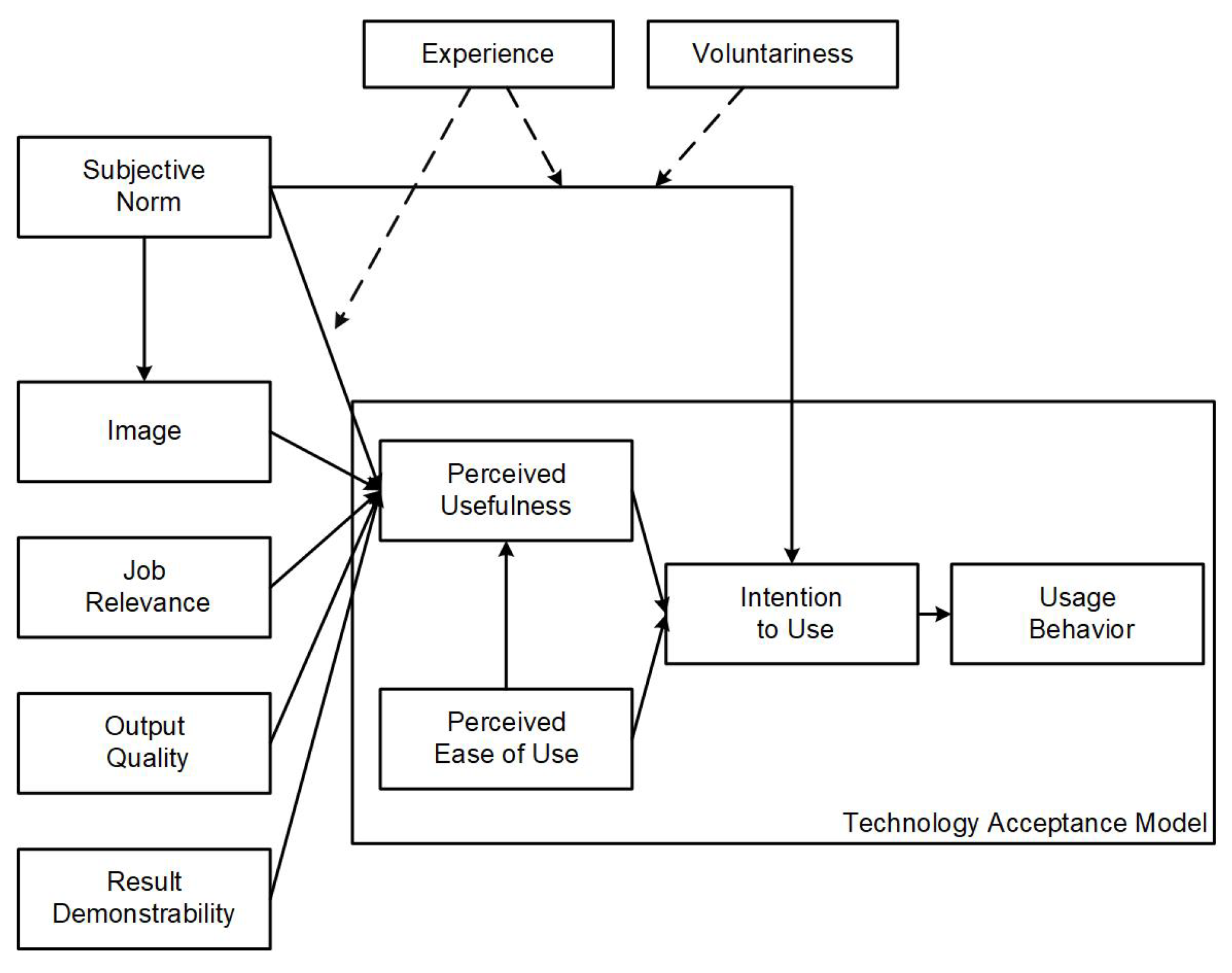 Proposed TAM2—Extension of the Technology Acceptance Model. Solid arrows indicate direct effects; dashed arrows indicate moderating effects.