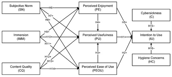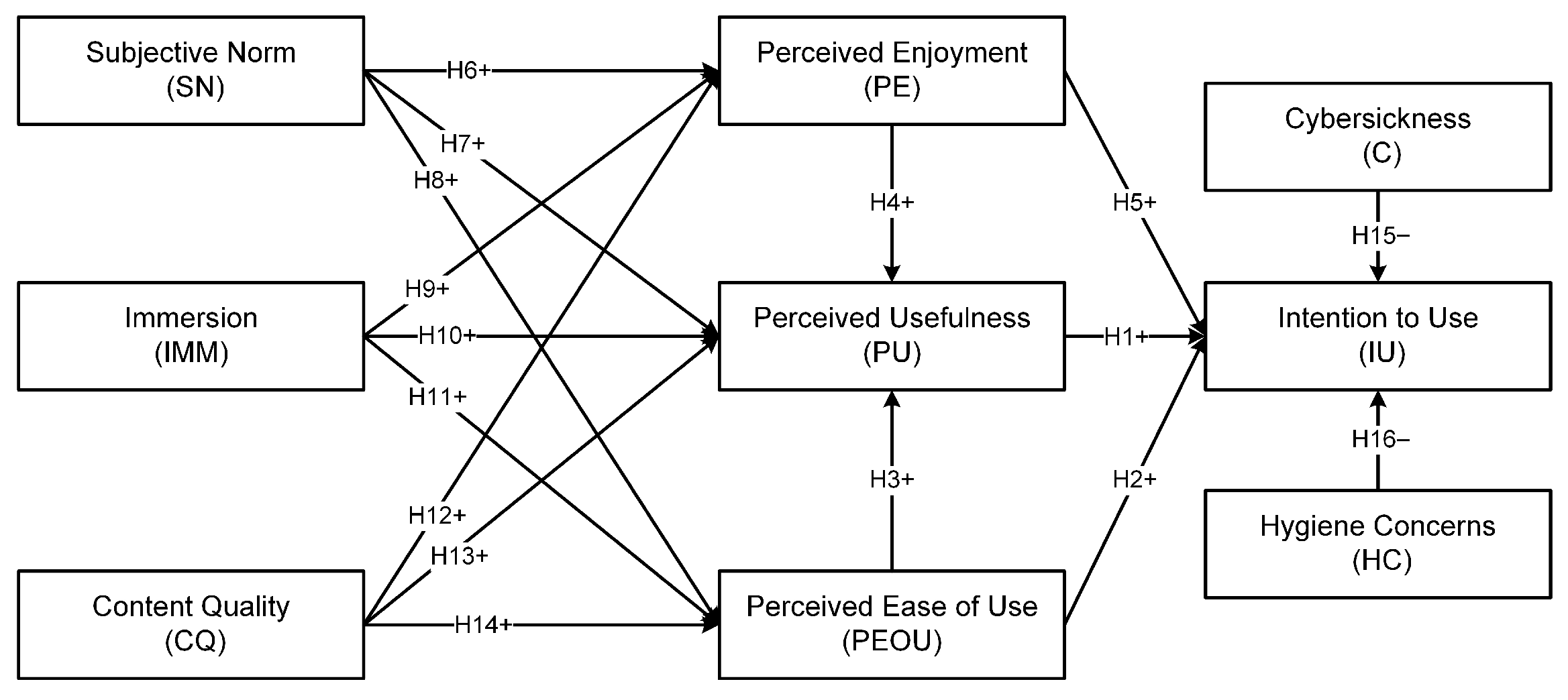 To address the identified research gap, this study develops a multi-dimensional model that synthesizes cognitive, hedonic, social, and contextual factors to explain Generation Z’s acceptance of museum VR. While grounded in the robust theoretical foundations of the Technology Acceptance Model (TAM) [22], our proposed model is substantially extended to account for the unique characteristics of the cultural heritage context and the target demographic. Specifically, drawing from the insights established in our literature review, the model (depicted in Figure 2) integrates key variables identified as critical in prior work, including experiential constructs (Perceived Enjoyment, Immersion, Content Quality), social dynamics (Subjective Norm), and context-specific perceived risks (Cybersickness, Hygiene Concerns). This integrated approach moves beyond a purely utilitarian view of technology adoption to provide a more holistic and nuanced explanation of user acceptance in an experientially rich informal learning environment.
