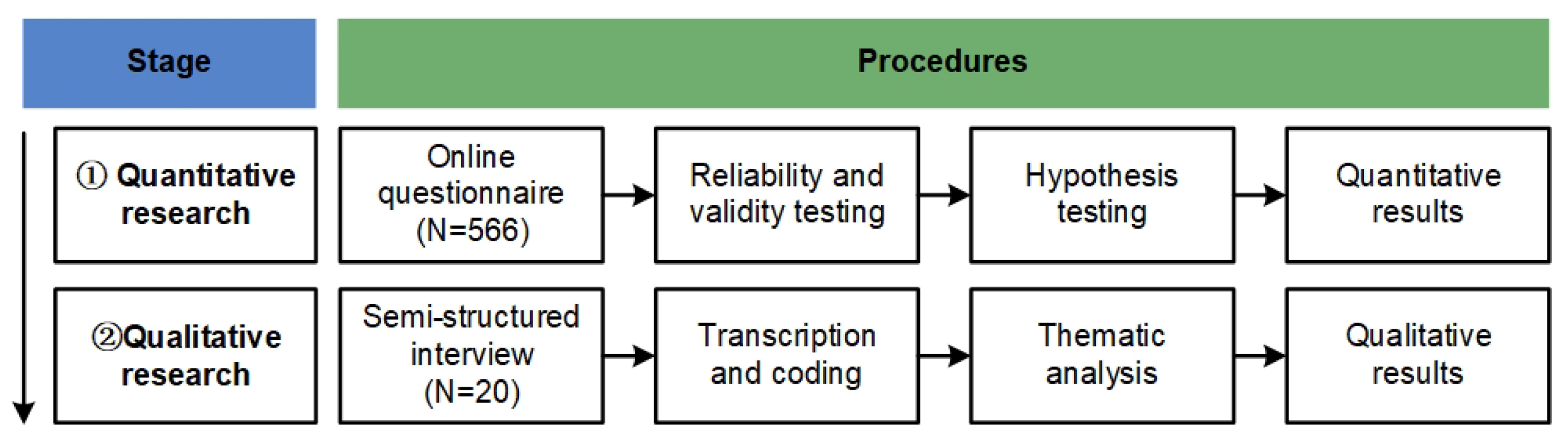 To empirically test the proposed model and answer our research questions, this study adopted an explanatory sequential mixed-methods design [35]. This approach is particularly well-suited for our objectives, as it allows for a comprehensive investigation wherein quantitative findings provide a broad overview of the relationships between variables, and subsequent qualitative data offer deep, contextualized explanations for those statistical results [36]. The research was structured in two distinct phases: first, a large-scale quantitative survey was conducted to validate the structural model; second, semi-structured interviews were carried out with a subset of survey participants to elaborate on and interpret the quantitative findings. The overall research procedure is illustrated in Figure 3.