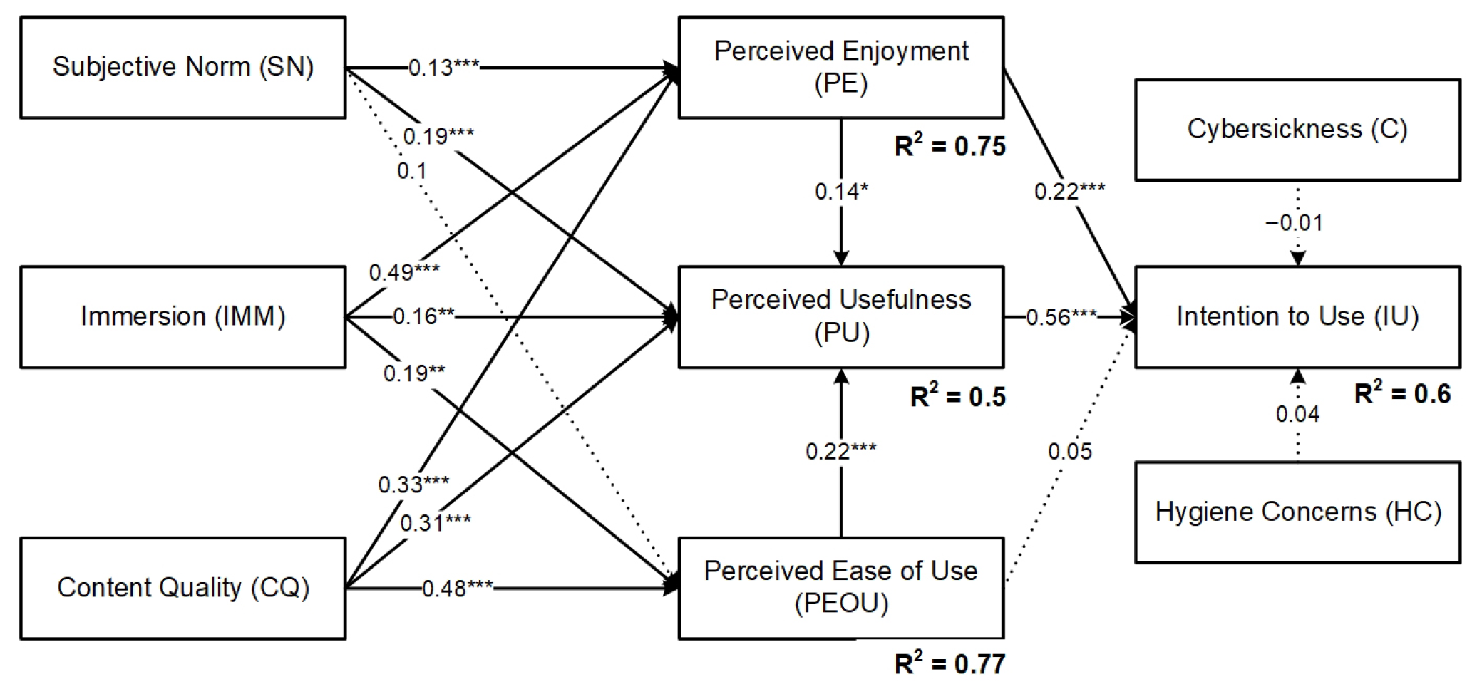 Finally, the model incorporates two potential inhibitors specific to the on-site use of shared VR headsets. Cybersickness (C) refers to symptoms of discomfort, such as nausea or dizziness, that can occur during VR exposure [33]. Such negative physical experiences are widely recognized as a significant barrier that can deter users from future use [34]. Hygiene Concerns (HC) relate to user apprehension regarding the cleanliness of shared devices that come into direct contact with the face. In public settings like museums, inadequate sanitation of shared equipment can be a major deterrent, negatively impacting a visitor’s willingness to engage with the technology [12]. Therefore, we propose the following hypotheses: