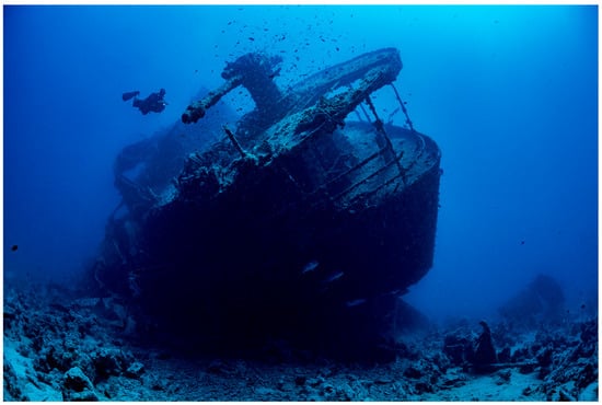 Sitting upright on a rocky seabed in 32 m of water, rising to a depth of 11.5 m at the peak of the wheelhouse, the wreck sits perfectly within the safe limits of recreational diving (Figure 2). Since the development of Sharm el-Sheikh as a major dive tourism resort in the 1990s the wreck has become one of the most popular diving locations in the Red Sea and is widely regarded as one of the best wrecks to dive in the world [4] (pp. 122–130).