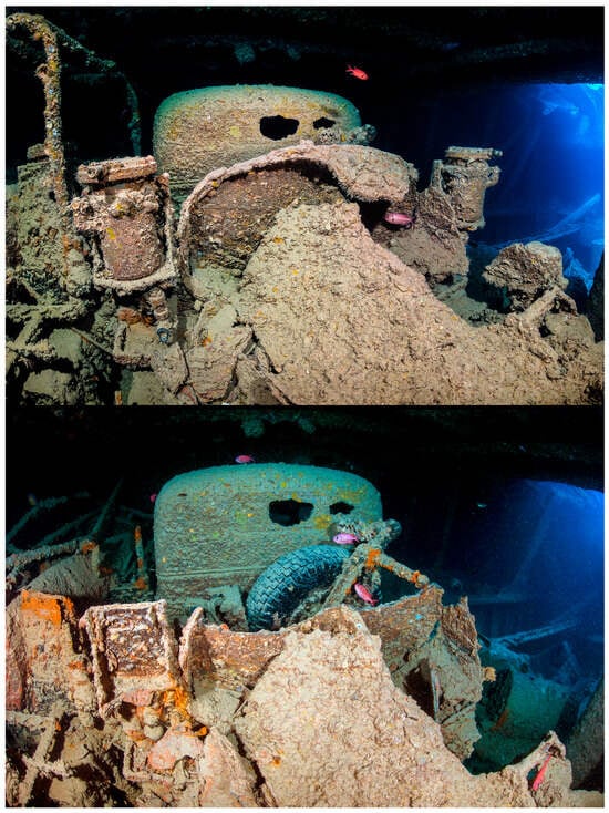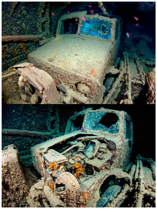 Mustard’s archive also captures the loss of objects with little or no scrap value, suggesting recreational divers may be taking items as souvenirs. For instance, the steering wheel of a Morris Commercial CS11/30 vehicle, documented in place in June 2008, was removed by June 2009 [3] (p. 19). Given that the steering wheel, constructed from a steel frame covered in Bakelite, holds no significant monetary value, the most likely reason for removal is by recreational divers seeking a memento from their visit. It is unknown if this activity is carried out with the knowledge of dive guides and vessel operators.