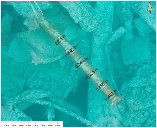 Finally, two flanged sections of the propeller shaft can be found within the shattered remains of Hold No. 4, one exiting the engine room area and one passing through the remains of the watertight bulkhead between Hold Nos. 4 and 5. With the absence of deck mooring bollards in this part of the wreck these features are frequently used by dive boats as a mooring point. Originally used to transfer the power from steam engine to propeller, the shaft is manufactured from steel and is of exceptionally robust construction. That said, it can be seen that mooring rope movement is eroding the steel, with the red oxidation covering indicating the process is ongoing. The original engineering drawings, to which the prop shaft would have been manufactured, are held by the Lloyds Register Foundation archive (Drawing No 10422) and record the diameter of the shaft, ranging from a minimum of 1′ ½″ (317 mm) to a maximum of 1′ ¾″ (323.85 mm). Photogrammetric survey of the shaft revealed that it now measures 203 mm at the narrowest point just behind the coupling flange (Figure 22). Without intervention, continued wear will lead to eventual failure of the shaft, risking vessel stability and diver safety during mooring operations. While the installation of sacrificial sleeves could mitigate damage, the use of the propeller shaft for mooring is not recommended due to these escalating risks.